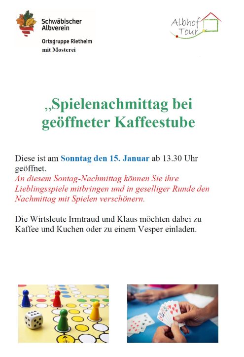 Spiele-Nachmittag 13:30 Uhr So., 15.01.2023, Münsingen/Rietheim Uhrzeit: 00:00 Ort: Albvereins-Stube Rietheim Münsingerstr. 72525 Münsingen/Rietheim iCalendar Mit dem Laden der Karte akzeptieren Sie die Datenschutzerklärung von Google.Mehr erfahren Karte laden Google Maps immer entsperren zur Übersicht