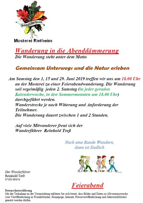 Wanderung in die Abendämmerung Treffpunkt 18:00 Uhr Sa., 01.06.2019, Münsingen/Rietheim Uhrzeit: 00:00 Ort: Mosterei Münsinger Straße 58 72525 Münsingen/Rietheim iCalendar Mit dem Laden der Karte akzeptieren Sie die Datenschutzerklärung von Google.Mehr erfahren Karte laden Google Maps immer entsperren zur Übersicht