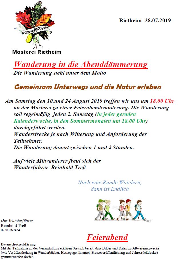 Wanderung in die Abenddämmereung 18:00 Uhr Sa., 24.08.2019, Münsingen/Rietheim Uhrzeit: 00:00 Ort: Mosterei Münsinger Straße 58 72525 Münsingen/Rietheim iCalendar Mit dem Laden der Karte akzeptieren Sie die Datenschutzerklärung von Google.Mehr erfahren Karte laden Google Maps immer entsperren zur Übersicht