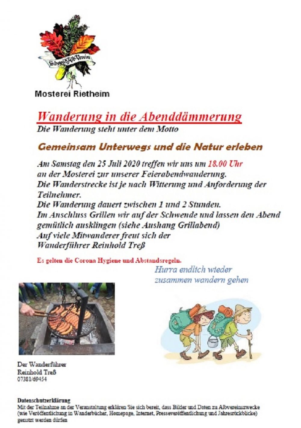 Wanderung in die Abenddämmerung 18:00 Uhr Sa., 25.07.2020, Münsingen/Rietheim Uhrzeit: Ganztägig Ort: Mosterei Münsinger Straße 58 72525 Münsingen/Rietheim iCalendar Mit dem Laden der Karte akzeptieren Sie die Datenschutzerklärung von Google.Mehr erfahren Karte laden Google Maps immer entsperren zur Übersicht