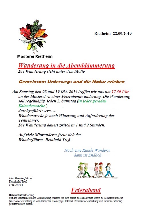 Wanderung in die Abenddämmerung 17:30 Uhr Sa., 05.10.2019, Münsingen/Rietheim Uhrzeit: Ganztägig Ort: Mosterei Münsinger Straße 58 72525 Münsingen/Rietheim iCalendar Mit dem Laden der Karte akzeptieren Sie die Datenschutzerklärung von Google.Mehr erfahren Karte laden Google Maps immer entsperren zur Übersicht
