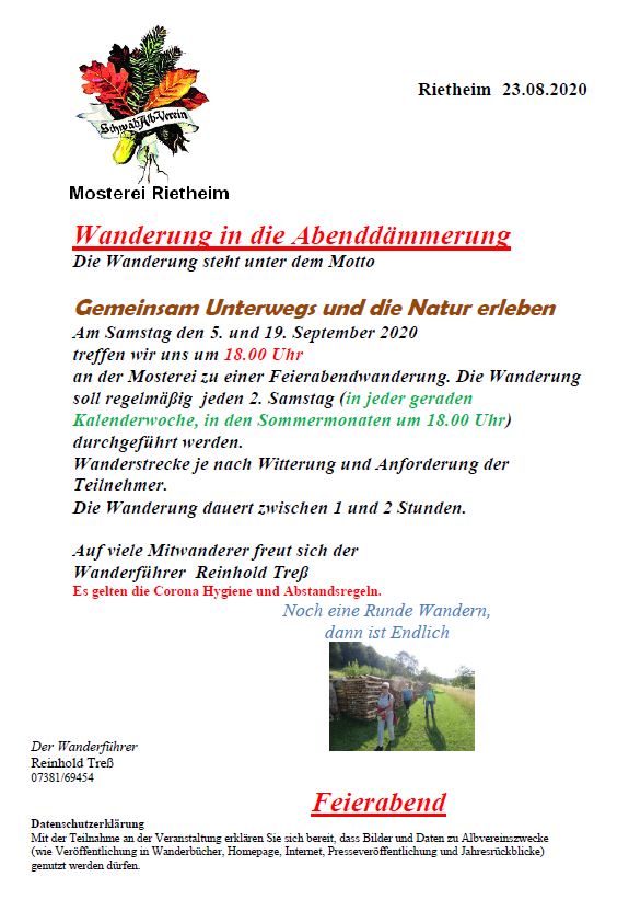 Wanderung in die Abenddämmerung 18:00 Uhr Sa., 05.09.2020, Münsingen/Rietheim Uhrzeit: Ganztägig Ort: Mosterei Münsinger Straße 58 72525 Münsingen/Rietheim iCalendar Mit dem Laden der Karte akzeptieren Sie die Datenschutzerklärung von Google.Mehr erfahren Karte laden Google Maps immer entsperren zur Übersicht