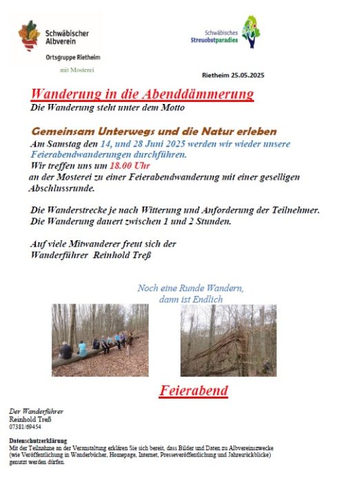 Wanderung in die Abenddämmerung 18:00 Uhr Sa., 28.06.2025, Münsingen/Rietheim Uhrzeit: 00:00 Ort: Mosterei Münsinger Straße 58 72525 Münsingen/Rietheim iCalendar Mit dem Laden der Karte akzeptieren Sie die Datenschutzerklärung von Google.Mehr erfahren Karte laden Google Maps immer entsperren zur Übersicht