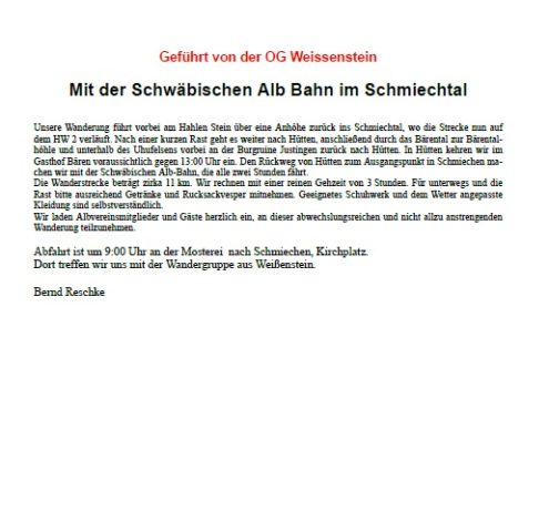Wanderung mit der OG Weißenstein, für kurzentschlossene 9:00 Uhr So., 28.09.2025, Münsingen/Rietheim Uhrzeit: 00:00 Ort: Mosterei Münsinger Straße 58 72525 Münsingen/Rietheim iCalendar Mit dem Laden der Karte akzeptieren Sie die Datenschutzerklärung von Google.Mehr erfahren Karte laden Google Maps immer entsperren zur Übersicht