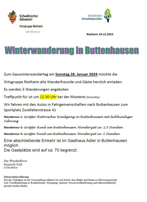 Winterwandertag in Buttenhausen 12:30 Uhr So., 28.01.2024, Münsingen/Rietheim Uhrzeit: 00:00 Ort: Mosterei Münsinger Straße 58 72525 Münsingen/Rietheim iCalendar Mit dem Laden der Karte akzeptieren Sie die Datenschutzerklärung von Google.Mehr erfahren Karte laden Google Maps immer entsperren zur Übersicht