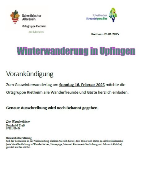 Winterwandertag So., 16.02.2025, Münsingen/Rietheim Uhrzeit: 00:00 Ort: Mosterei Münsinger Straße 58 72525 Münsingen/Rietheim iCalendar Mit dem Laden der Karte akzeptieren Sie die Datenschutzerklärung von Google.Mehr erfahren Karte laden Google Maps immer entsperren zur Übersicht